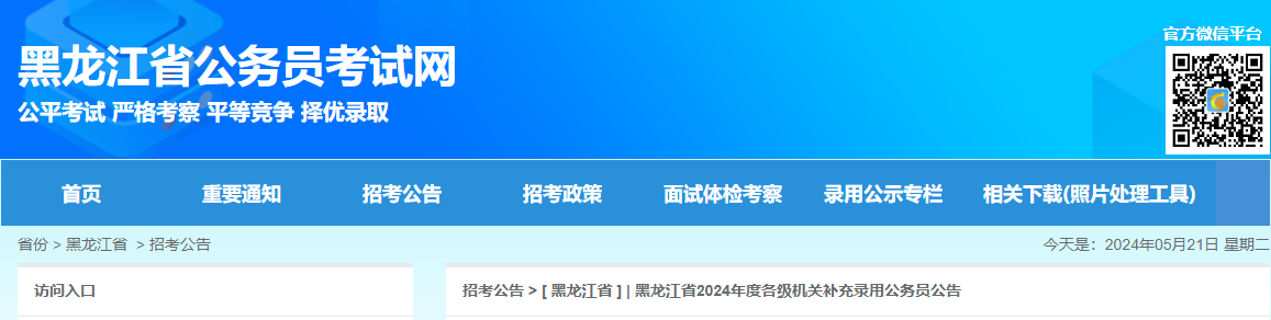 从黑龙江省公务员考试网发布的《2024年黑龙江省各级机关补充录用公务员公告》中获悉,2024年黑龙江补充录用公务员面试资格确认时间:2024年5月28日9:00至6月3日17:00,具体安排详情如下: