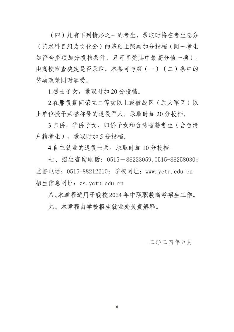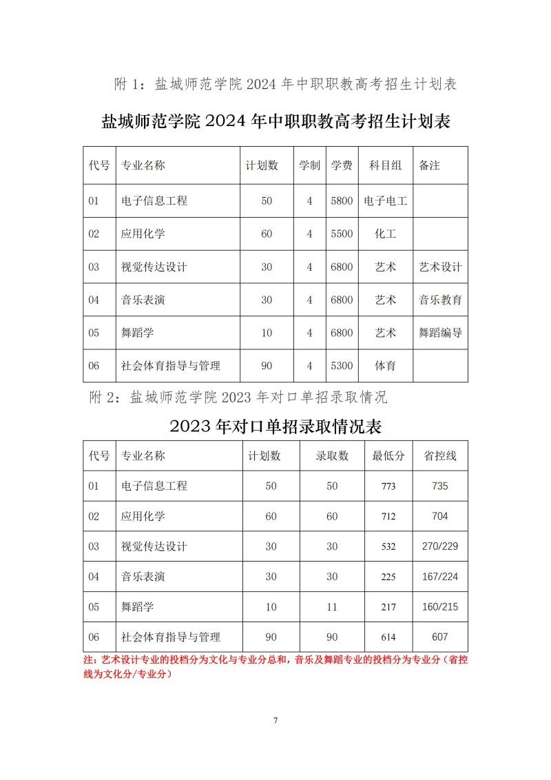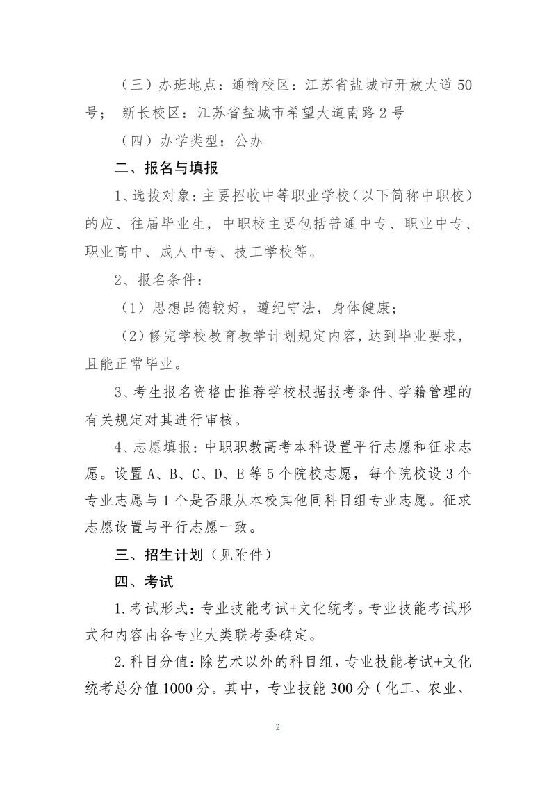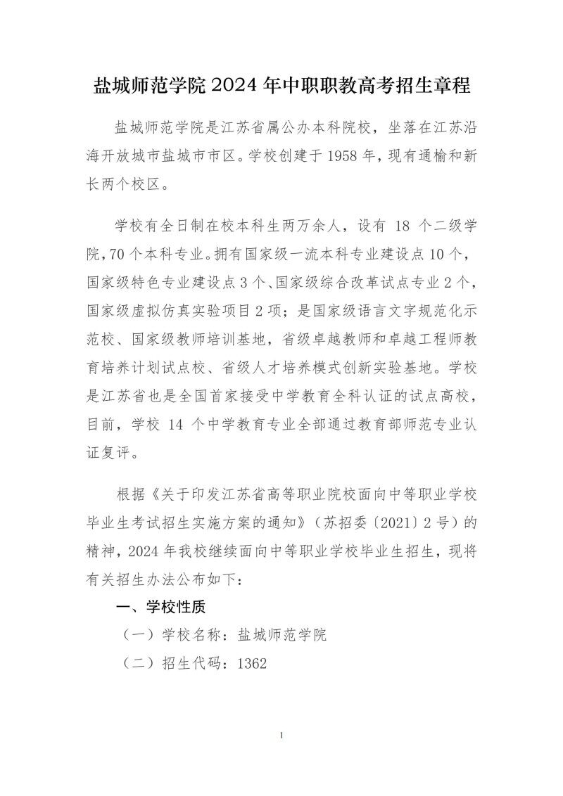 盐城师范学院2024年中职职教高考招生章程